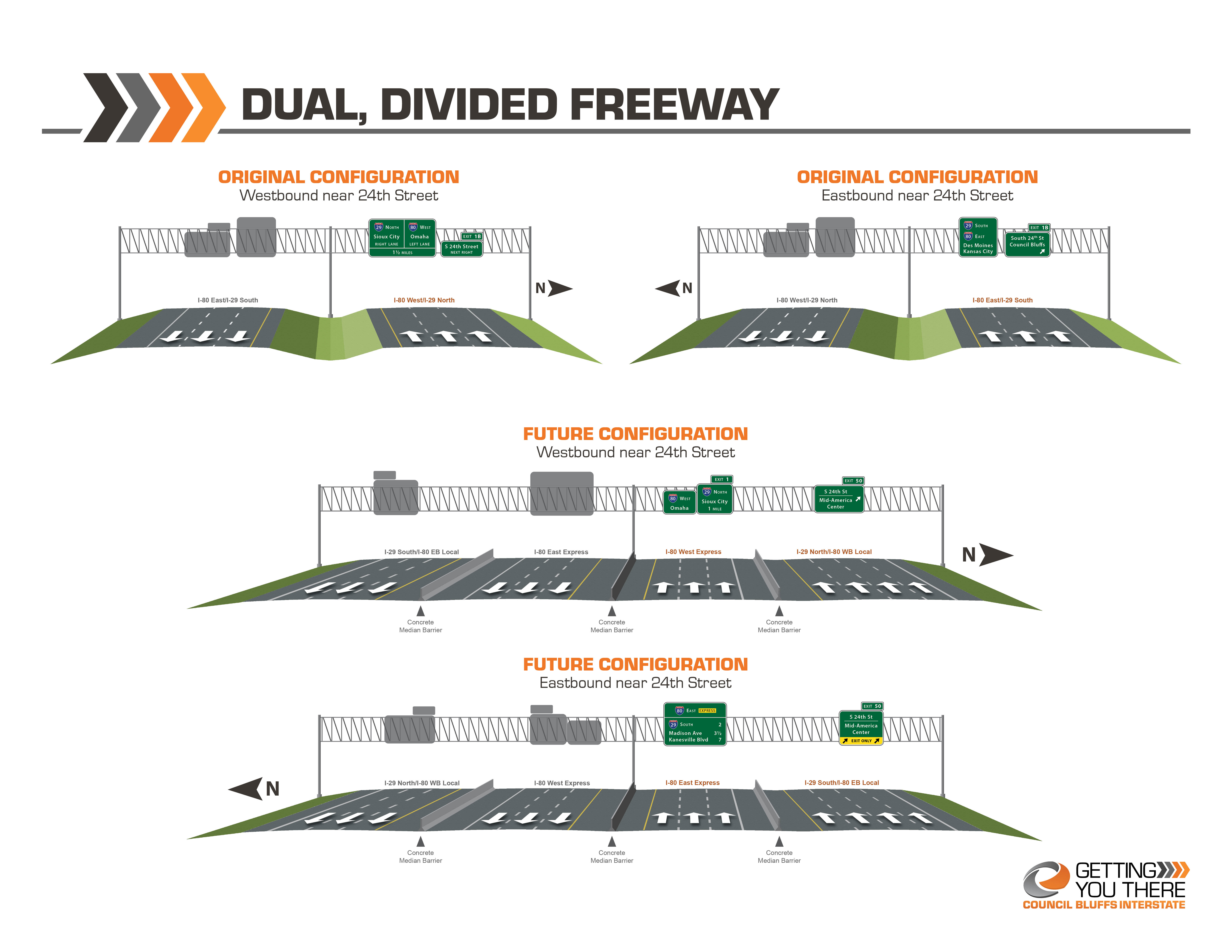 The dual, divided freeway was constructed to include three lanes in each direction for I-80 Express and three lanes in each direction for I-29/I-80 Local.